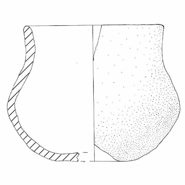 Orlo di forma arrotondata, corpo globoso, fondo piatto. Colore: marrone giallo chiaro.