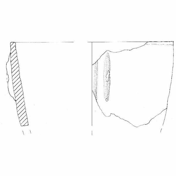 Orlo piatto leggermente ingrossato; parete sub-rettilinea. Poco sotto l'orlo due listarelle a sezione triangolare disposte verticalmente. Colore superficie: grigio rosa.