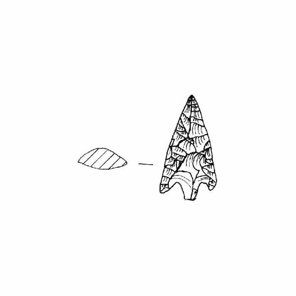 Punta foliata con peduncolo. Ritocco piatto, coprente bifacciale, regolare. Margini leggermente covessi, punta triangolare, alette conv. all'alto, peduncolo a margini rettilinei e base piana. Sezione convesso-bombata. Superficie lucida. Colore grigio chiaro 5Y7/1.