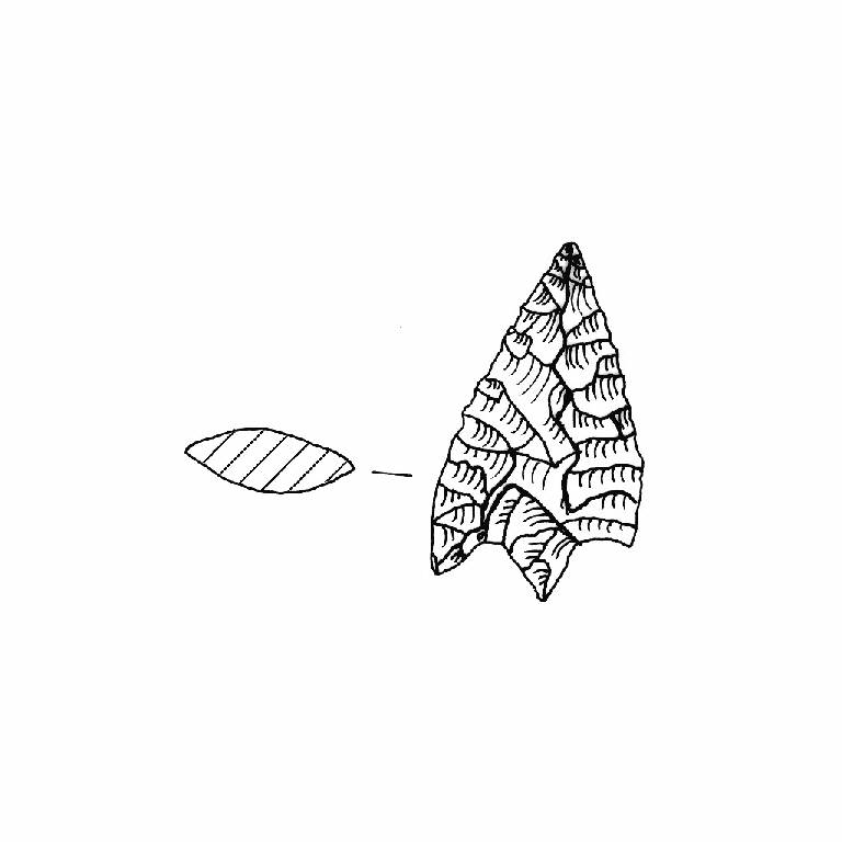 Punta foliata con peduncolo. Ritocco piatto, coprente bifacciale, regolare,denticolato. Margini convessi, punta triangolare, alette convergenti all'alto di cui la destro accennata, peduncolo triangolare. Sezione bombata. Superficie lucida. Colore grigio 5Y5/1.