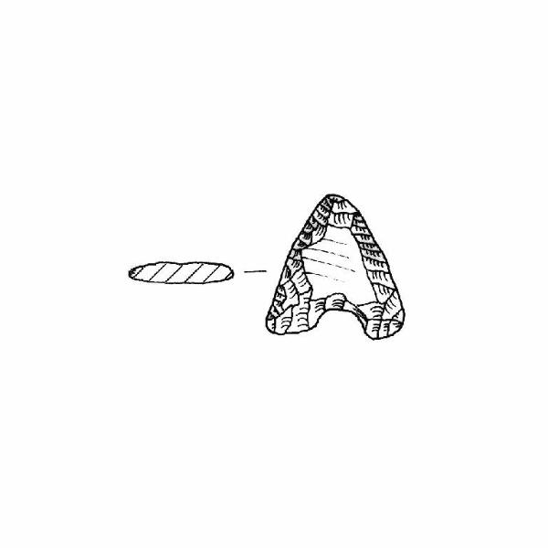 Punta foliata a base concava. Ritocco piatto, invadente, bifacciale, regolare. Margini leggermente convessi, punta arrotondata, alette a terminazione piana. Sezione appiattita. Superficie lucida screziata. Colore oliva 5Y5/4 oliva 5Y5/6 grigio molto scuro 2,5Y6/0.