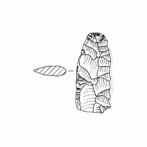 Raschiatoio foliato multiplo ritocco piatto, coprente, bifacciale, denticolato sul margine destro. Margini leggermente convessi, margine superiore e inferiore rettilinei. Sezione convessa. Superficie lucida gloss sul margine sinistro. Colore bruno 10YR6/3.