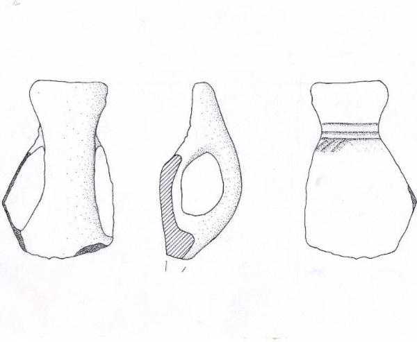 Orlo di forma arrotondata; parete distinta lievemente concava con andamento sub-verticale. Ansa sopraelevata ad ascia decorata, internamente nel punto di attacco alla parete, da 3 solcature orizzontali sovrastanti una fascia di corte solcature oblique poco profonde. Colore: grigio.