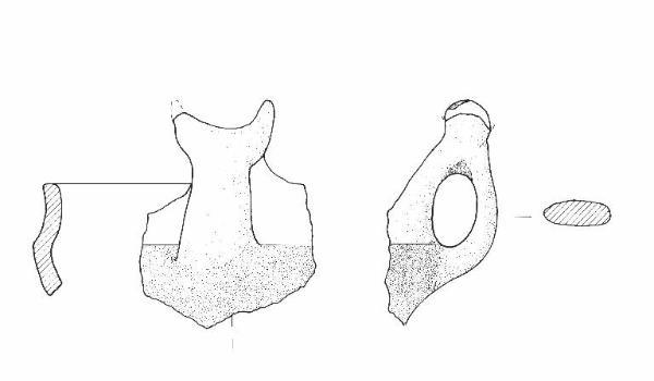 Orlo di forma piatta; parete distinta concava; diametro max maggiore del diametro orlo; vasca probabilmente a calotta. Ansa a sezione nastriforme con sopraelevazione lunata. Colore: marrone-grigio chiaro.
