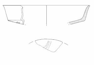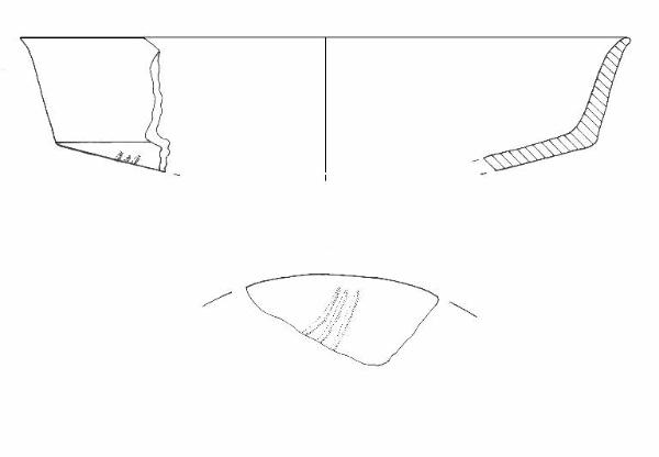 Orlo di forma arrotondata, assottigliato; parete distinta rettilinea, svasata verso l'orlo; vasca troncoconica.\nDecorazione: sulla vasca resti di una decorazione a solcature formante un motivo a festone. Colore: bruno chiaro.