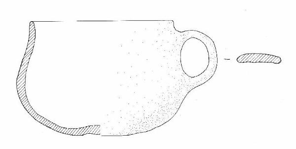 Corpo a sacco. Orlo di forma arrotondata, assottigliato; fondo ombeliato. Ansa nastriforme ad anello impostata poco sotto l'orlo e in corrispondenza del diametro max. Colore: bruno