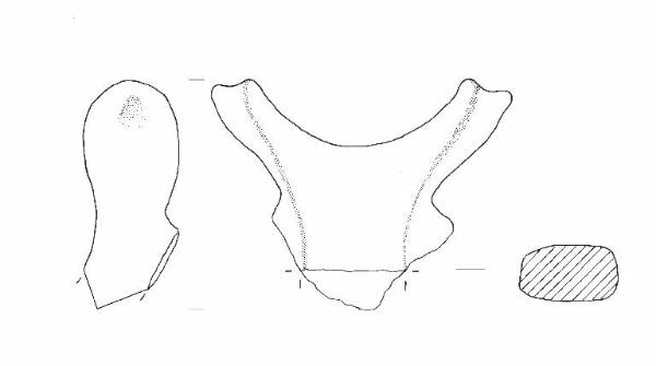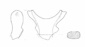 Sezione nastriforme; sopraelevazione con ampia falcatura ad appendici a muso animale stilizzato. Colore: da beige a rosa.