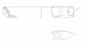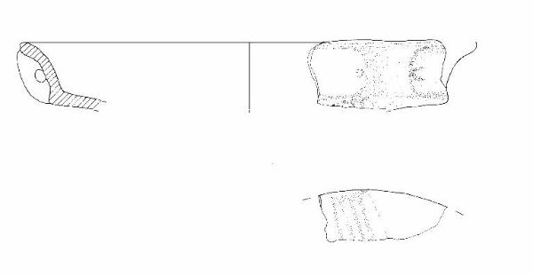 Orlo di forma arrotondata, lievemente esoverso; parete distinta concava, svasata verso l'orlo; vasca troncoconica. Ansa a tunnel impostata in corrispndenza dell'orlo e del diametro max.\nDecorazione: sulla vasca 4 solcature disposte obliquamente. Colore: beige