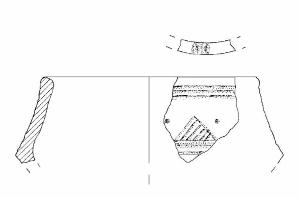 Orlo di forma arrotondata, obliquo verso l'interno, decorato con 4 brevi solcature; parete superiore rettilinea.\nDecorazione: sulla parete superiore due fasci di tre solcature orizzontali che delimitano un motivo di denti di lupo riempiti a tratteggio, separati da piccole coppelle. Colore: marrone grigio molto scuro.