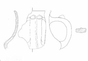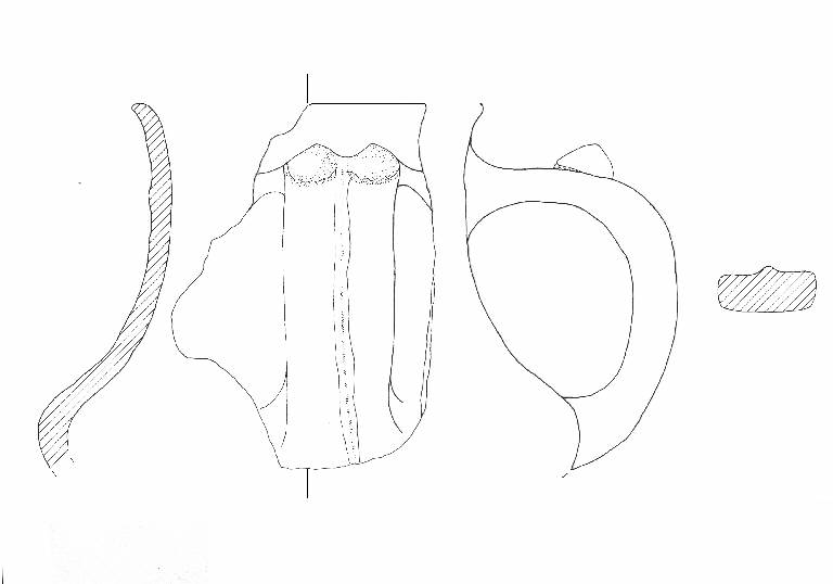Orlo di forma arrotondata, lievemente esoverso; ansa nastriforme ad anello con due bottoni plastici all'apice e cordone plastico disposto nel senso della unghezza dell'ansa in posizione mediana. Colore: bruno.