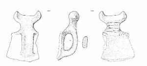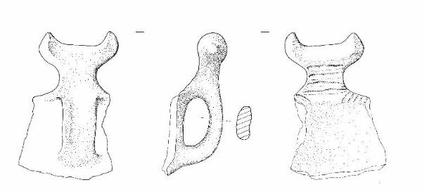Ansa a nastro con sopraelevazione lunata ed espansioni laterali con espansioni coniche, insellatura poco profonda e quasi rettilinea. Verso l'interno della vasca il supporto della sopraelevazione è decorato con 4 solcature orizzontali. Brevi solcature oblique, almeno 5 per parte, sono disposte sull'orlo ai lati dell'ansa. Colore: grigio scuro