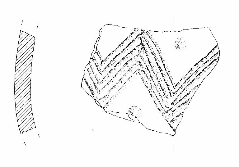 Fr. di vasca decorata da fasci di leggere solcature disposte a formare un motivo a zig-zag e da coppelle. Colore: marrone grigio.