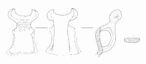 Orlo di forma arrotondata, assottigliato e leggermente esoverso; parete distinta rettilinea rastremata verso l'orlo. Ansa lunata ad appendici coniche decorata, internamente, con un fascio di 3 solcature orizzontali parallele e 3 coppelle sottostanti. Colore: grigio.