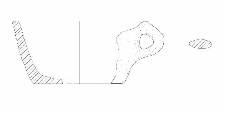 Orlo di forma arrotondata, pareti rettilinee, fondo piano. Ansa nastriforme ad anello impostata all'orlo. Colore: bruno