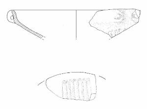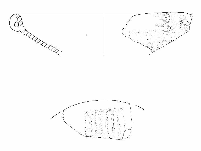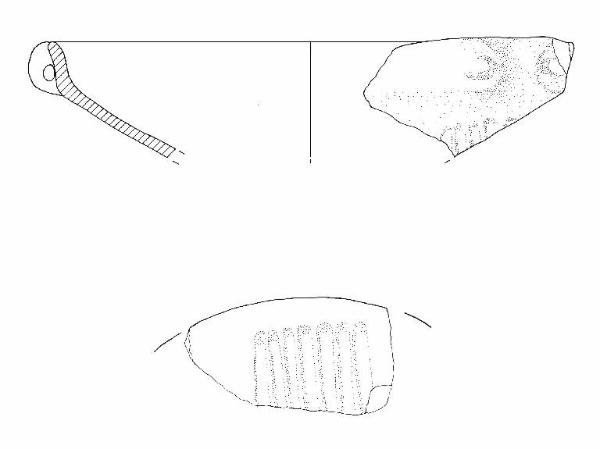 Orlo di forma arrotondata; parete distinta leggermente concava, svasata verso l'orlo; vasca troncoconica. Ansa a tunnel impostata all'orlo e sul diametro max.\nDecorazione: sulla vasca fascio di sette solcature, disposte verticalmente, che probabilmente formavano un motivo cruciforme. Colore: bruno.