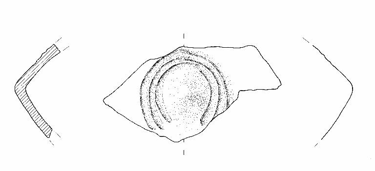 Il fr. corrisponde alla porzione in corrispondenza del diametro max, caratterizzata dalla presenza di una grossa bugna conica cava.\nDecorazione: intorno alla bugna tre solcature disposte a semicerchio. Colore: grigio molto scuro.