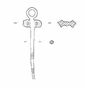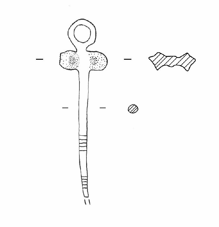 La testa è caratterizzata dalla presenza di un anello aperto e di due appendici ad anello chiuse con appendici coniche su ambo i lati.\nGambo a sezione circolare decorato da due fasci di sottili linee incise.
