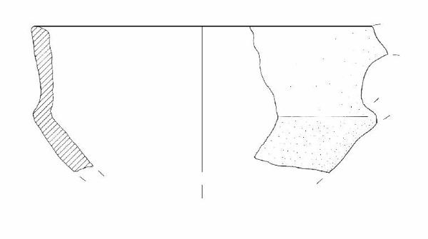 Orlo di forma arrotondata; parete distinta verticale, rettilinea; vasca a calotta. L'ansa, che era nastriforme, è impostata all'orlo e in corrispondenza del diametro max. Colore: beige.