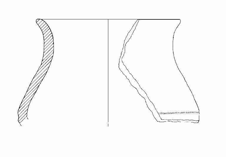 Orlo di forma arrotondata, esoverso.\nDecorazione: sottile solcatura in corrispondenza del diametro max. Colore: bruno.