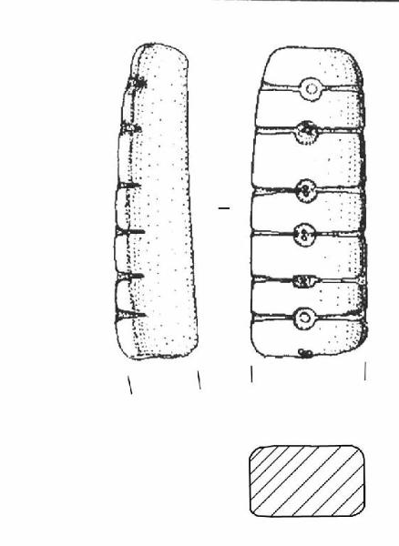 Forma rettangolare. \nDecorazione: sei linee incise con una coppella al centro. Colore: grigio scuro.