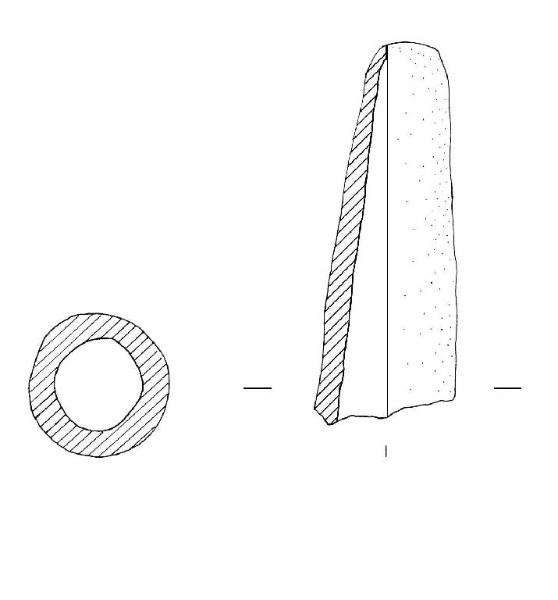 Forma sub-cilindrica a sezione circolare; foro passante centrale. Colore: marrone grigio molto scuro.