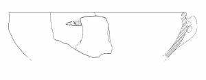 Orlo di forma arrotondata, obliquo verso l'interno; corpo articolato con breve parete superiore lievemente concava e vasca emisferica. Ansa nastriforme a gomito.\nBreve cordone plastico con bugnetta sferoidale in corrispondenza dell'attacco superiore dell'ansa.\nSulla vasca, in corrsipondenza dell'attacco inferiore dell'ansa, leggera solcatura. Colore: marrone grigio molto scuro.
