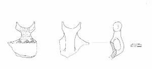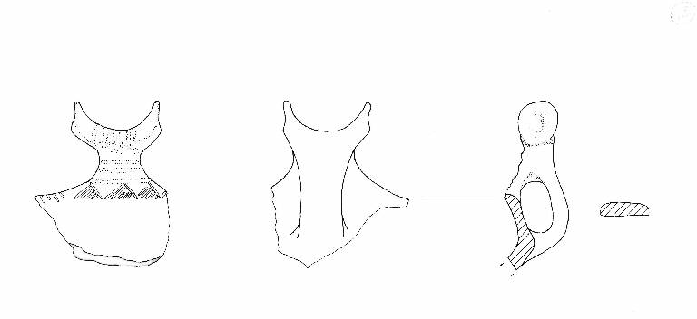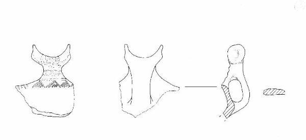 Orlo di forma arrotondata, assottigliato; parete distinta rastremata verso l'rlo; vasca troncoconica. Ansa nastriforme con sopraelevazione falcata ad ppendici coniche.\nDecorazione: sulla sommità dell'ansa, 7 brevi solcature; sul ponticello discendente dell'ansa 4 solcature orizzontali; poco sotto l'orlo, internamente in corrispondenza dell'attacco dell'ansa, motivo a denti di lupo riempiti a tratteggio. Colore: grigio.