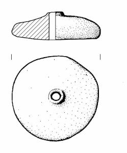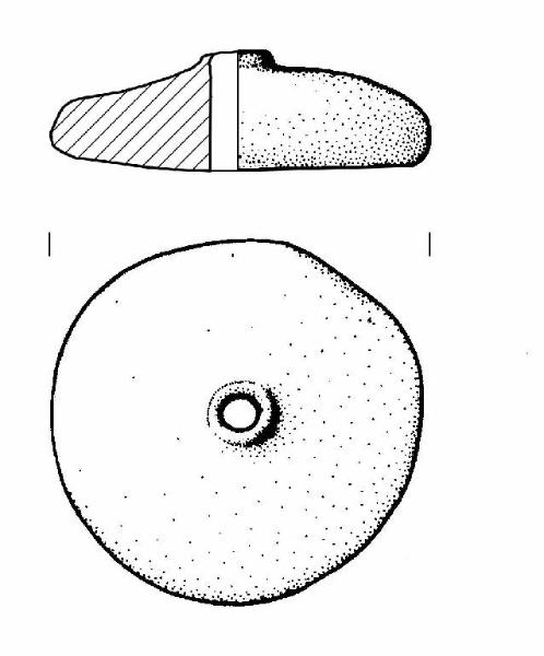 Sezione piano-convessa e foro mediano passante; al centro della faccia convessa il foro è contornato da un collarino a rilievo. Colore: rosa.