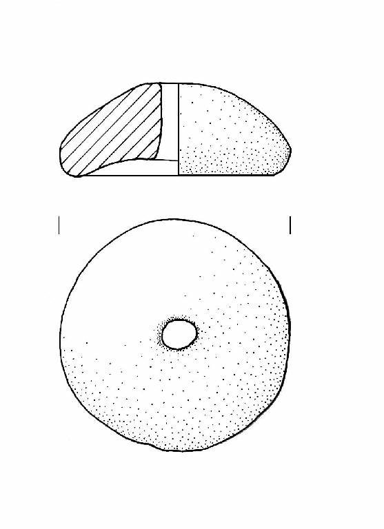 Corpo a calotta, base concava. Foro mediano pessante. Colore: grigio.