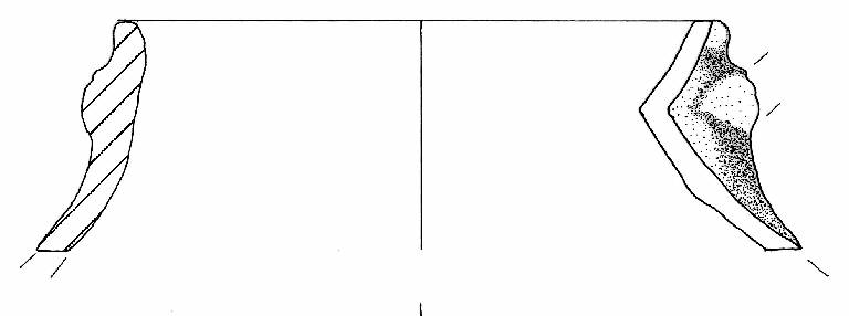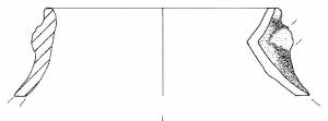 Orlo appiattito, labbro leggermente esoverso e parete a profilo sinuoso. A breve distanza dall'orlo vi sono due tracce dell'attacco superiore di un'ansa. Colore: bruno scuro.