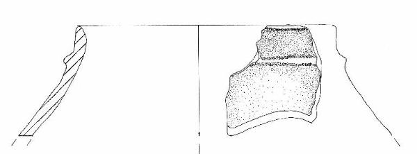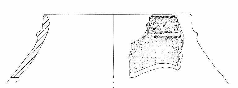 Orlo arrotondato, assottigliato, parete a profilo sinuoso. A breve distanza dall'orlo è impostato un cordone orizzontale. Colore: bruno chiaro con fiammate di colore rosso.