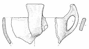 Orlo arrotondato, corpo a profilo continuo, ansa a nastro soprelevata, ad ascia, con margine superiore rettilineo.\nImpasto a tessitura media, di colore grigio (7,5R6/0), inclusi puntiformi, granulosi e grossolani, con frequenza abbondante e distribuzione irregolare. Superficie lisciata e a tratti lucidata, di colore grigio (2,5Y5/0).