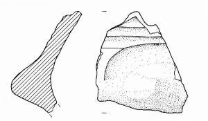 Frammento di parete di vaso a corpo biconico, è presente una bugna contornata da una solcatura semicircolare, sopra la quale sono visibili tre scanalature orizzontali e parallele.\nImpasto di colore grigio (10YR5/1), inclusi puntiformi, granulosi e grossolani, con frequenza scarsa e distribuzione irregolare. Superficie a tratti lisciata, esterna di colore grigio-rosa (7,5YR7/2), interna di colore grigio scuro (7,5R4/0).