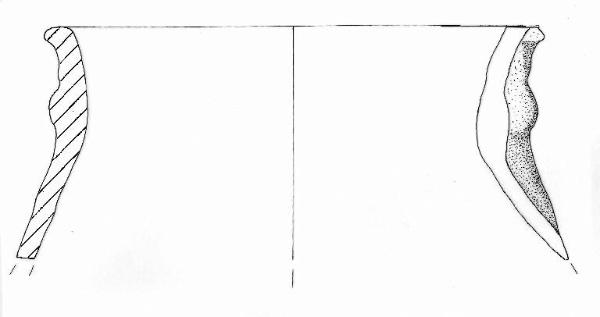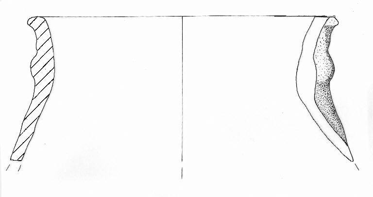 Orlo appiattito, obliquo verso l'esterno e parete a profilo sinuoso. A breve distanza dall'orlo è impostato un cordone orizzontale. \nColore: grigio.