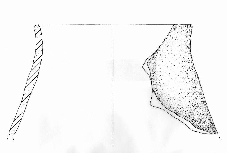 Orlo appiattito, parete a profilo sinuoso. Inlusi litici anche di grandi dimensioni. Lisciatura sommaria. Colore: bruno scuro.