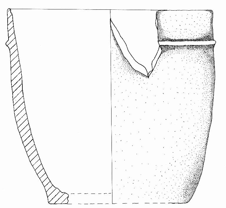 Orlo arrotondato, assottogliato, parete a profilo convesso e base piana. A breve distanza dall'orlo è impostato un cordone orizzontale a sezione triangolare. Inclusi litici di piccole dimensioni. Colore: bruno chiaro all'orlo e più scuro sul ventre.