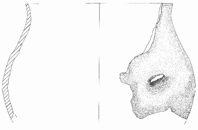 Orlo appiattito, obliquo verso l'esterno e labbro leggermente estroflesso. All'altezza del diametro massimo è presente traccia di una presa a linguetta molto pronunciatao dell'attacco inferiore di un'ansa.\nInclusi litici anche di grandi dimensioni. Colore: grigio scuro.