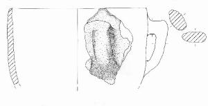 Orlo arrotondato, parete a profilo rettilineo. A breve distanza dall'orlo è impostata un'ansa nastriforme con profilo as orecchio. Colore: grigio/bruno.