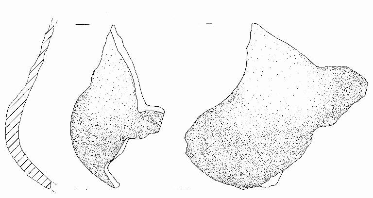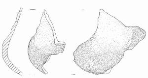 Frammento di parete a profilo sinuoso. Inclusi litici anche di grandi dimmensioni. Colore: grigio con fiammate rossastre.