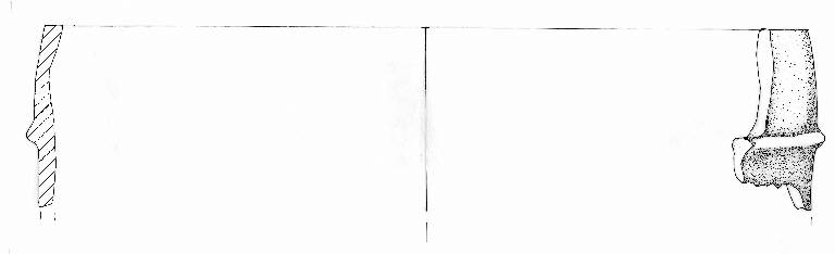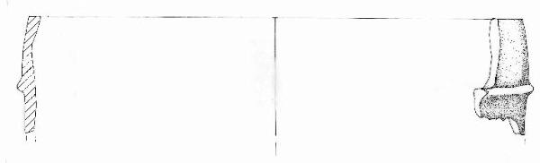 Orlo appiattito. parete a profilo convesso. A breve distanza dall'orlo è impostato un cordone orizzontale. Inclusi litici anche di grandi dimensioni. Tracce di resti vegetali commbusti sia all'interno che all'esterno. Superficie a tratti scabra. Colore: nero.