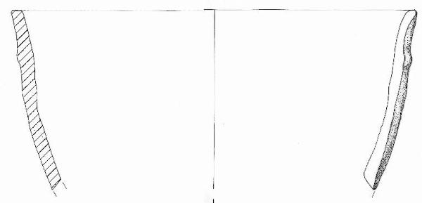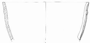 Orlo appiattito, parete a profilo convesso. A breve distanza dall'orlo è impostato un cordone orizzontale in alcuni punti poco pronunciato. Tracce di resti vegetali combusti su entrambe le superfici. \nInclusi litici anche di grandi dimensioni\nColore: nero.