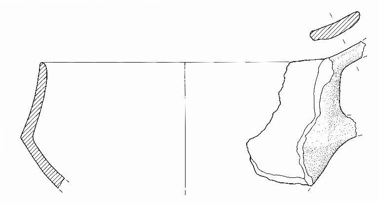 Orlo arrotondato, corpo carenato, sono visibili gli attacchi di un'ansa a nastro verticale soprelevata, impostata su orlo e carena.\nImpasto a tessitura media, di colore grigio chiaro (7,5R8/0), inclusi puntiformi e granulosi, con frequenza abbondante e distribuzione irregolare. Superficie lisciata e a tratti lucidata, di colore grigio (2,5Y5/0).\nSuperficie lisciata e a tratti lucidata, di colore grigio-rosa (5YR7/2) e grigio (7,5R7/0).