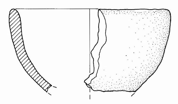 Orlo arrotondato ed ingrossato, corpo semisferico.\nImpasto a tessitura media, di colore grigio (7,5R6/0), inclusi puntiformi e granulosi, con frequenza abbondante e distribuzione irregolare. Superficie lisciata, di colore grigio (7,5R5/0).