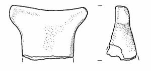 Frammento di ansa a nastro verticale, soprelevata, a "T", con margine superiore leggermente concavo. Impasto a tessitura fine, di colore grigio (7,5R6/0), inclusi puntiformi e granulosi, con frequenza abbondante e distribuzione irregolare. Superficie lisciata e a tratti lucidata, di colore grigio scuro (2,5Y4/0).