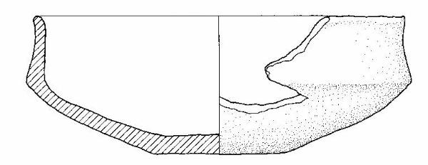Orlo arrotondato, corpo carenato a parete leggermente concava, con Ø orlo < Ø carena, vasca troncoconica, fondo piatto.\nImpasto a tessitura fine, di colore grigio chiaro (7,5R8/0), inclusi puntiformi e granulosi, con frequenza abbondante e distribuzione irregolare. Superficie lisciata e a tratti lucidata, di colore grigio (7,5R5/0).