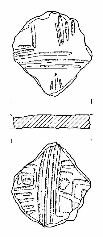 Fondo piatto, motivi a solcature rettilinee e circolari su fondo esterno ed interno.\nImpasto a tessitura grossolano, di colore grigio chiaro (7,5R8/0), inclusi granulosi e grossolani, con frequenza abbondante e distribuzione irregolare. Superficie scabra, di colore grigio (2,5Y5/0).