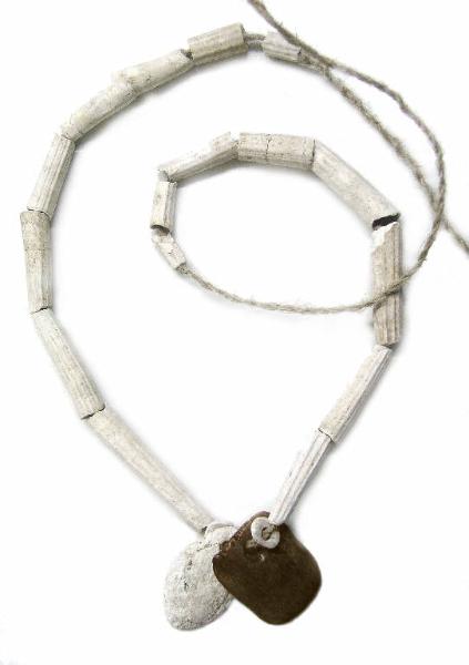 Sedici tubetti di dentalium fossile; 3 dischetti integri e vari frr. di madreperla; un pendaglio in quarzo di forma ovaleggiante con foro passante circolare in posizione eccentrica; un pendaglio quadrangolare in lamina ossea, levigato solo su una faccia con foro passante collocato in corrispondenza di uno dei lati.