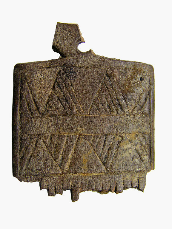 Piccolo manico pentagonale con foro passante; forma rettangolare. Decorazione: due file di denti di lupo riempiti a tratteggio racchiusi da una cornice.