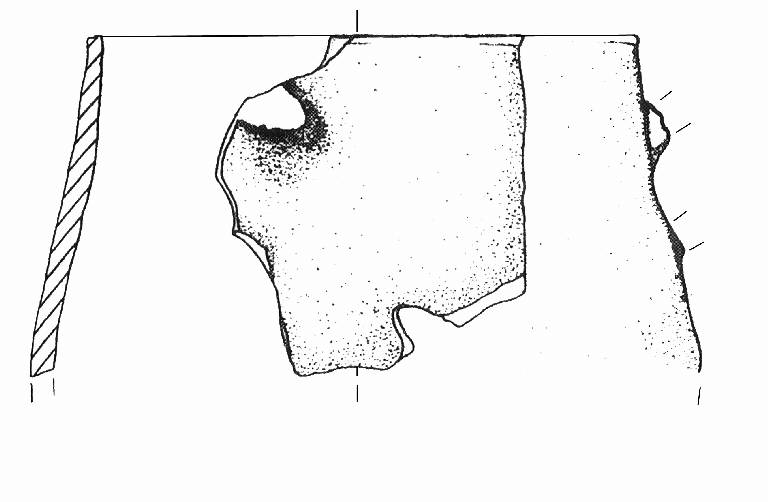 Orlo appiattito; corpo piriforme. A breve distanza dall'orlo, attacco superiore dell'ansa. Colore: bruno.