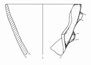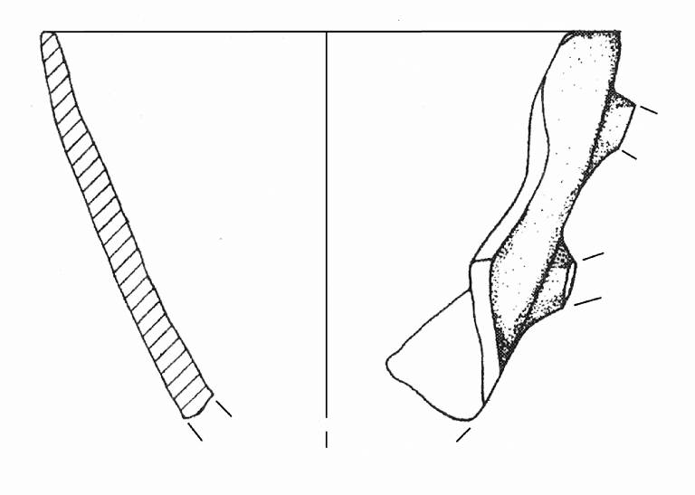 Orlo piatto; parete a profilo convesso. A breve distanza dall'orlo, attacco superiore dell'ansa. Colore: bruno chiaro con fiammate rossastre e grigie.